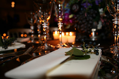 The reception centerpieces were designed low to the table, allowing the evening to feel like an intimate candlelit dinner party. I considered the whole tablescape when creating the brides reception design. Vintage inspired silver-footed compote bowls overflowed with bountiful creations of Dutch blue hydrangea, purple lisianthus and garden stock, camellia foliage and velvety dusty miller. We chose chairs only found at Tablescapes Rentals that feature a champagne colored finish – a warm accent to the silver tones used on the table. Exquisite solid silver chargers were topped with a folded navy napkin framing the dinner menu and a charming sprig of seasonal privet berries. The elegant shape of the Murano stemware oozed elegance, as the table was lit with an abundance of candlelight.
