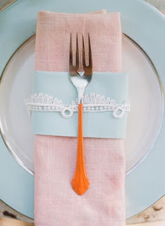 This cast away scrap fork that was dressed up by dipping it in paint.  Simple!  The napkin rings are composed of a band of paper and scalloped lace trim.