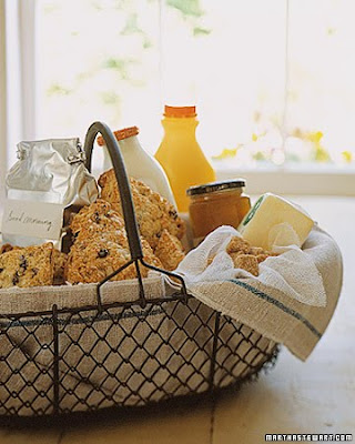 For the Day of the Large Affair: Ding-dong-ditch your hostess the morning of her gathering. She’ll no doubt be busy all day bustling around town, tidying up her home and preparing loads of details for the evening soiree. Allow her to enjoy a hardy breakfast by putting together a basket packed with fresh scones, jams, juice, milk and note about how excited you are to join them later.