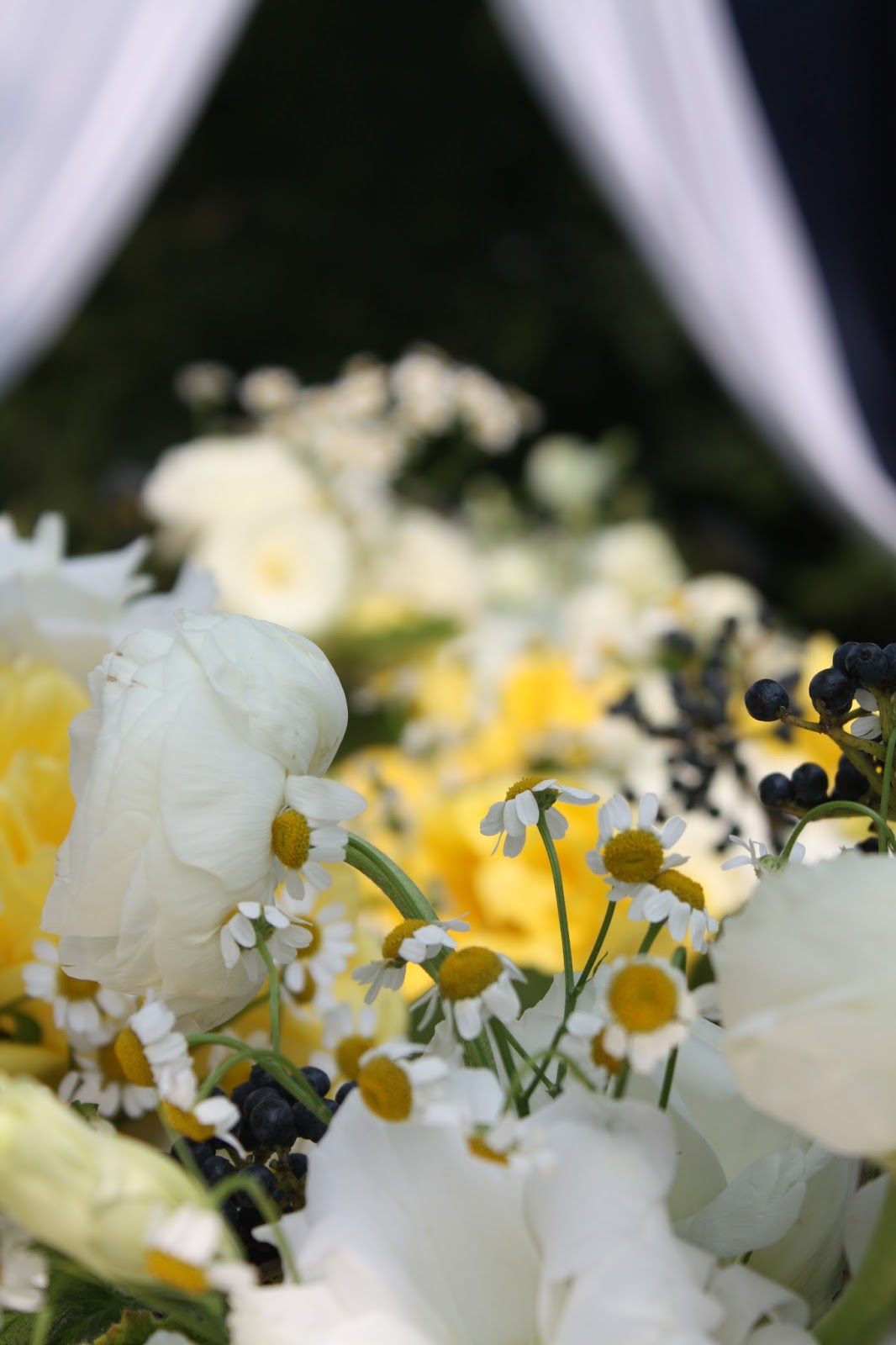 Jesse designed all of the flowers – an undulating collection of perfection in whites, yellows, navy and green. Jesse used milk glass, crystal and hammered gold for all of the pieces and knew precisely what flowers would make me nutty with love: Ranunculus, fluffy roses, hydrangea, whimsical chamomile, privet berry and velvety geranium foliage.