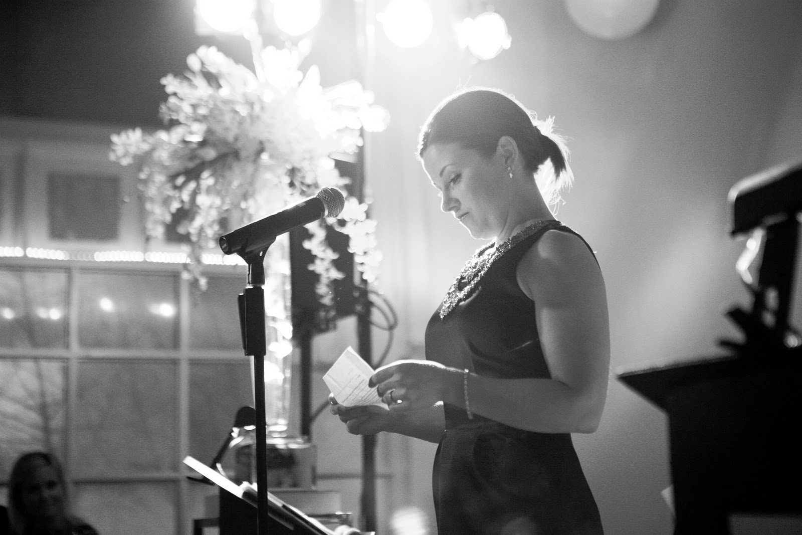 After the ceremony, guests were ushered back to the foyer for a second cocktail hour {fun or trouble?!} as we all pitched in to transform the ceremony room into the simple and elegant reception. The lovely Amy of Blumen had perfectly chic collections of monogfloral bundles of white flowers including lisianthus {above}, orchids and roses detailing the varied white linen-clad dinner tables.