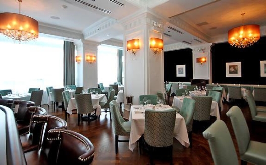 Mixed muted metallics, grainy wood, orb-like chandeliers and unexpected pops of kelly green dress up the Pump Room.