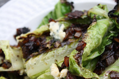 When there seemed to be gorgeous action on the grill, I removed the decently charred lettuce heads and brought them back inside where I topped them with the balsamic onion/bacon mixture and salty salty English stilton bits.