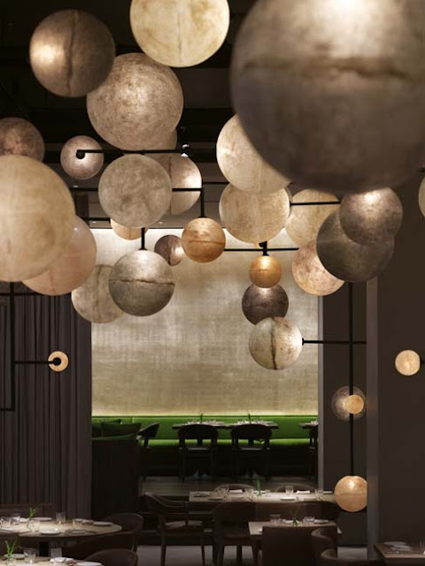 Mixed muted metallics, grainy wood, orb-like chandeliers and unexpected pops of kelly green dress up the Pump Room.