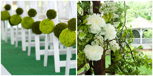 The aisle was simply noted with pomanders of bun moss and button pomps suspended from silk ribbons.